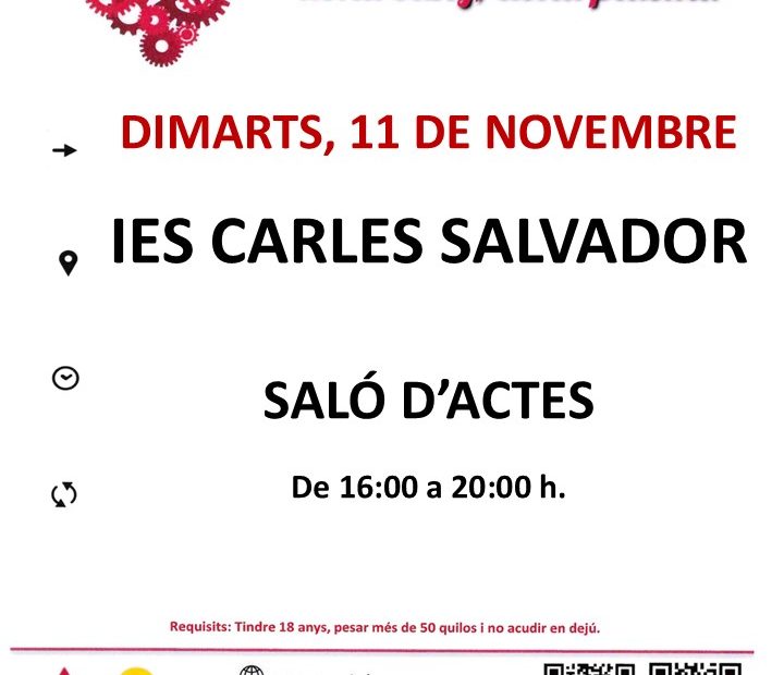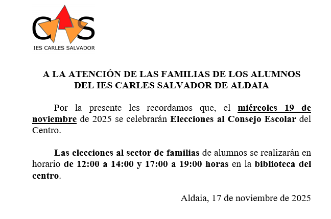 A LA ATENCIÓN DE LAS FAMILIAS DE LOS ALUMNOS DEL IES CARLES SALVADOR DE ALDAIA Por la presente les recordamos que, el miércoles 19 de noviembre de 2025 se celebrarán Elecciones al Consejo Escolar del Centro. Las elecciones al sector… Leer más »horario votaciones familias