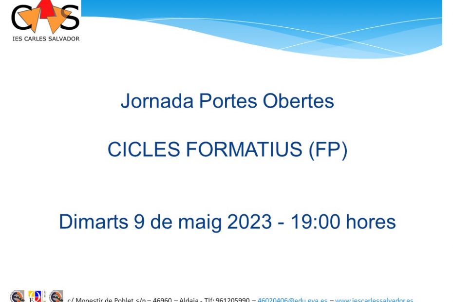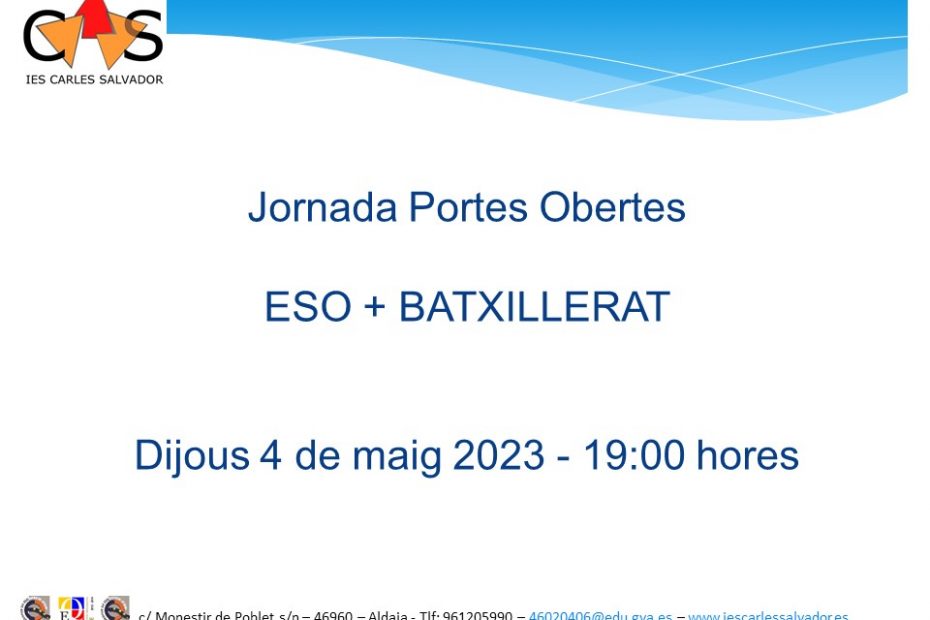 El dijous 4 de maig de 2023, a les 19:00 hores, realitzarem la Jornada de Portes obertes per donar a coneixer a les famílies i l’alumnat interessat l’oferta formativa d’educació secundària obligatòria (ESO) i Batxillerat, de l’IES Carles Salvador d’Aldaia,… Llegiu més »Jornada de portes obertes ESO + BATX – 4 de maig 19:00 hores.