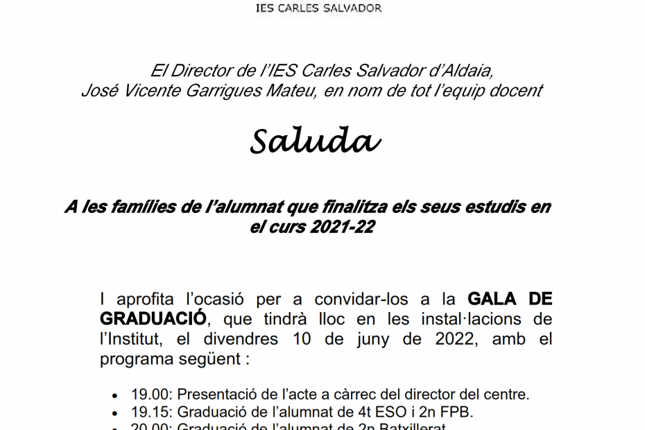 ADJUDICACIÓ DE VACANTS CICLES IES CARLES SALVADOR ALDAIA – SETEMBRE 2022 CICLE DATA LLOC FASES CFGS (Adm i Finances) 12/09/2022 16:30 h Saló d’Actes Acte públic únic d’adjudicació de vacants en el següent ordre: 1.- Alumnat de cicles en llista… Llegiu més »Adjudicació vacants cicles formatius – setembre 2022
