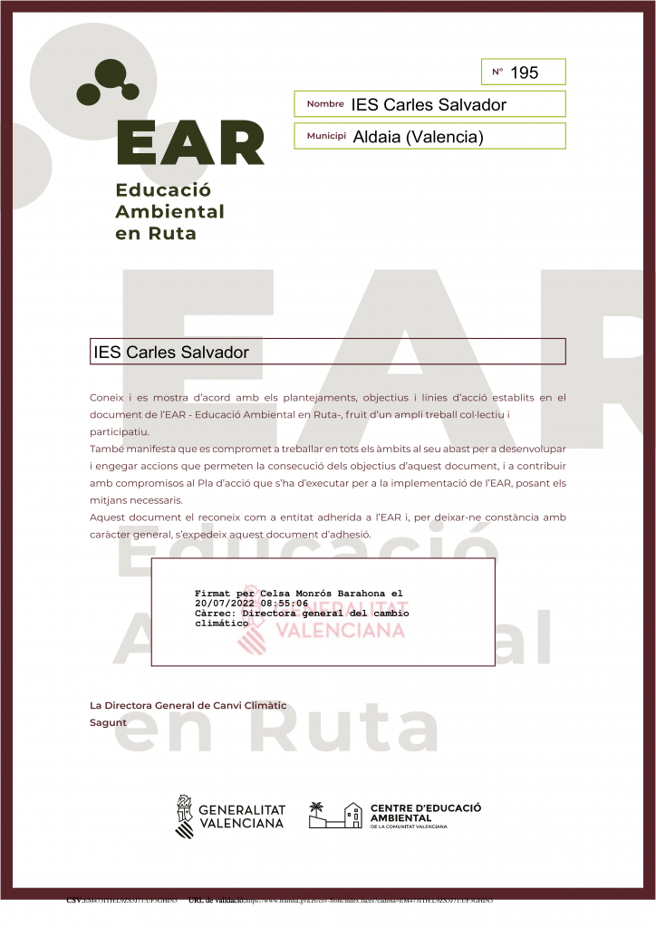 L’IES Carles Salvador ha rebut el reconeixement com a centre d’Educació Ambiental en Ruta (EAR) dins del programa Ambiental de la comunitat valenciana.