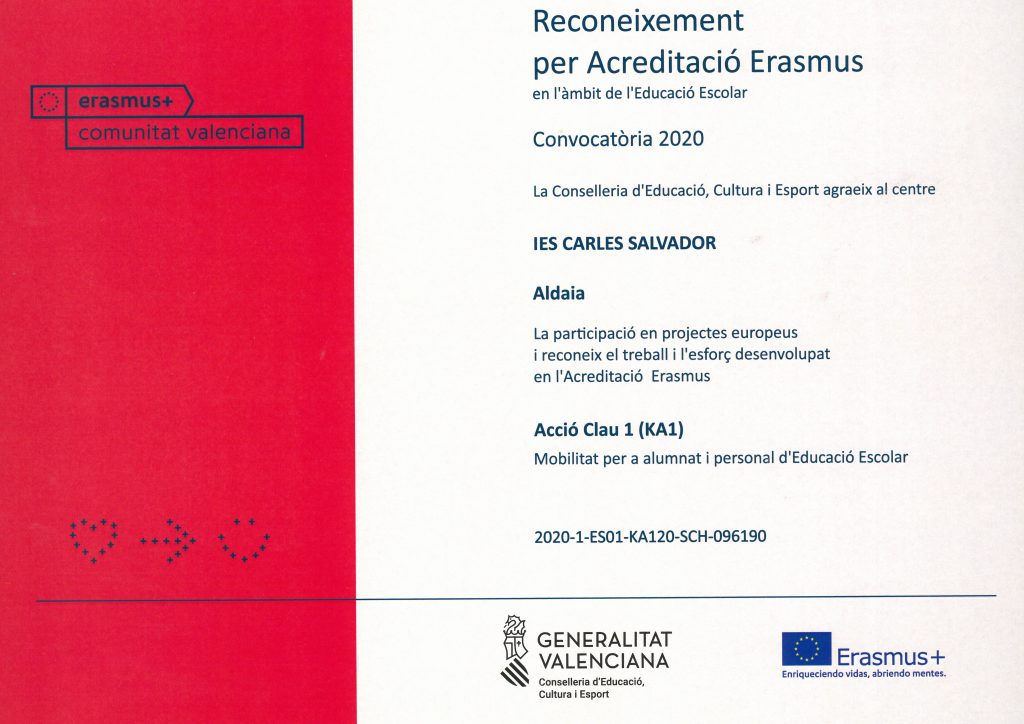 El passat dijous, 3 de novembre de 2022, a la Sala d’Actes de la Conselleria d’Educació, Cultura i Esport (Av. Campanar, 32- València), l’IES Carles Salvador va rebre el reconeixement per l’Acreditació Erasmus en l’àmbit de l’Educacio Escolar.