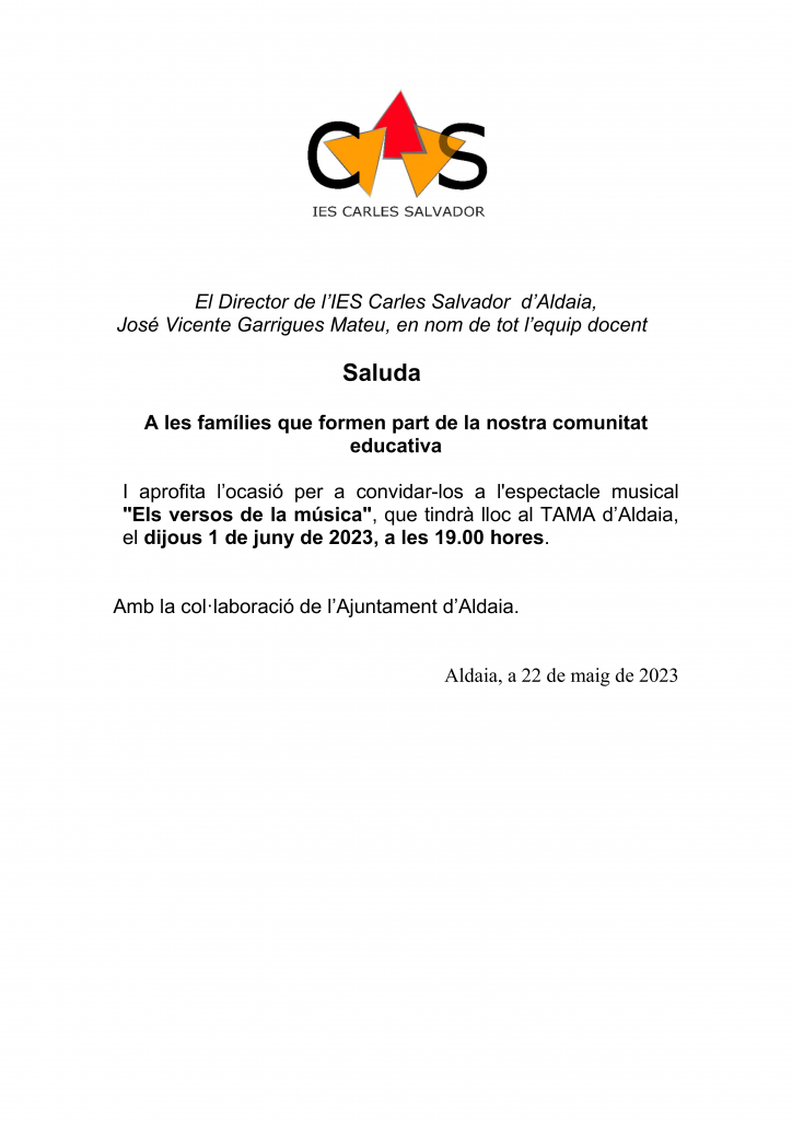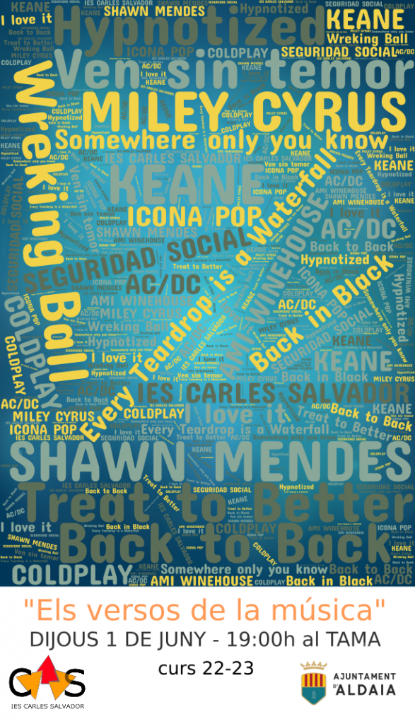 El proper dijous 1 de juny de 2023, a les 19 hores, realitzarem l’espectacle musical “els versos de la música” al TAMA d’Aldaia.