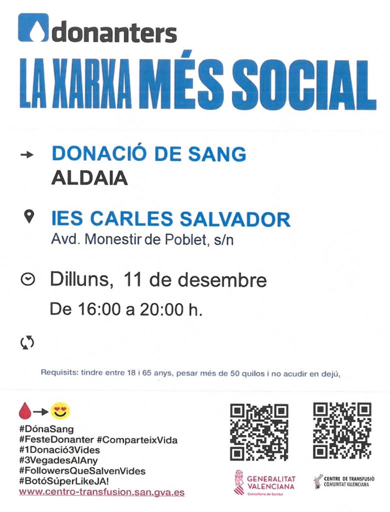 El proper dilluns 11 de desembre realitzarem una donació de sang al centre IES Carles Salvador, en col·lalboració amb el centre de transfusions de la Generalitat Valenciana i l’Ajuntament d’Aldaia.