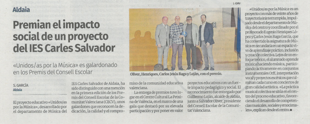 El projecte “Units/des per la música” presentat pel departament de música del IES Carles Salvador d’Aldaia ha rebut un reconeixement a la convocatòria de PREMIS del Consell Escolar de la Comunitat Valenciana 2025.
