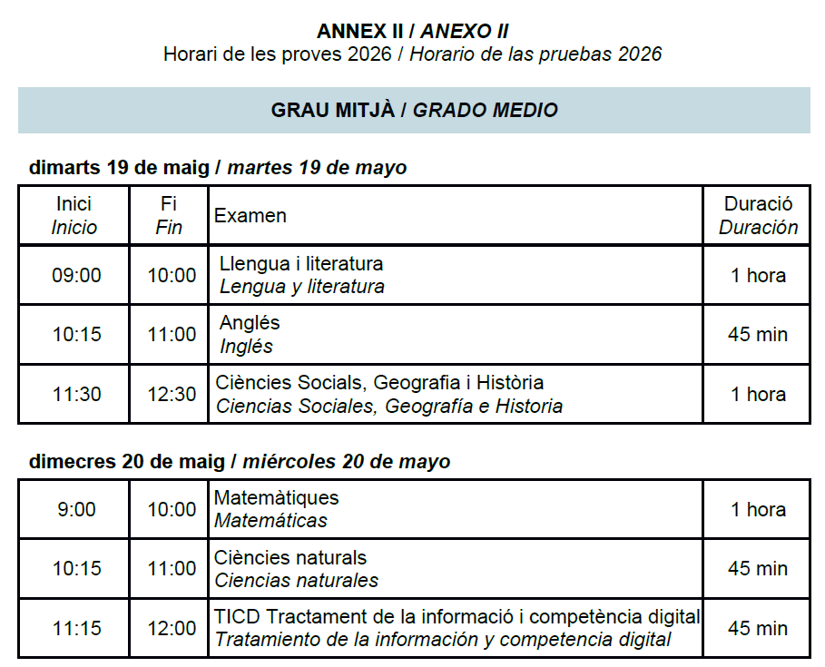 S’ han convocat les Proves d’Accés a Cicles Formatius de Grau Mitjà i de Grau Superior, per al 2026. [Descarrega el document pdf amb aquesta informació] [Convocatòria 2026]